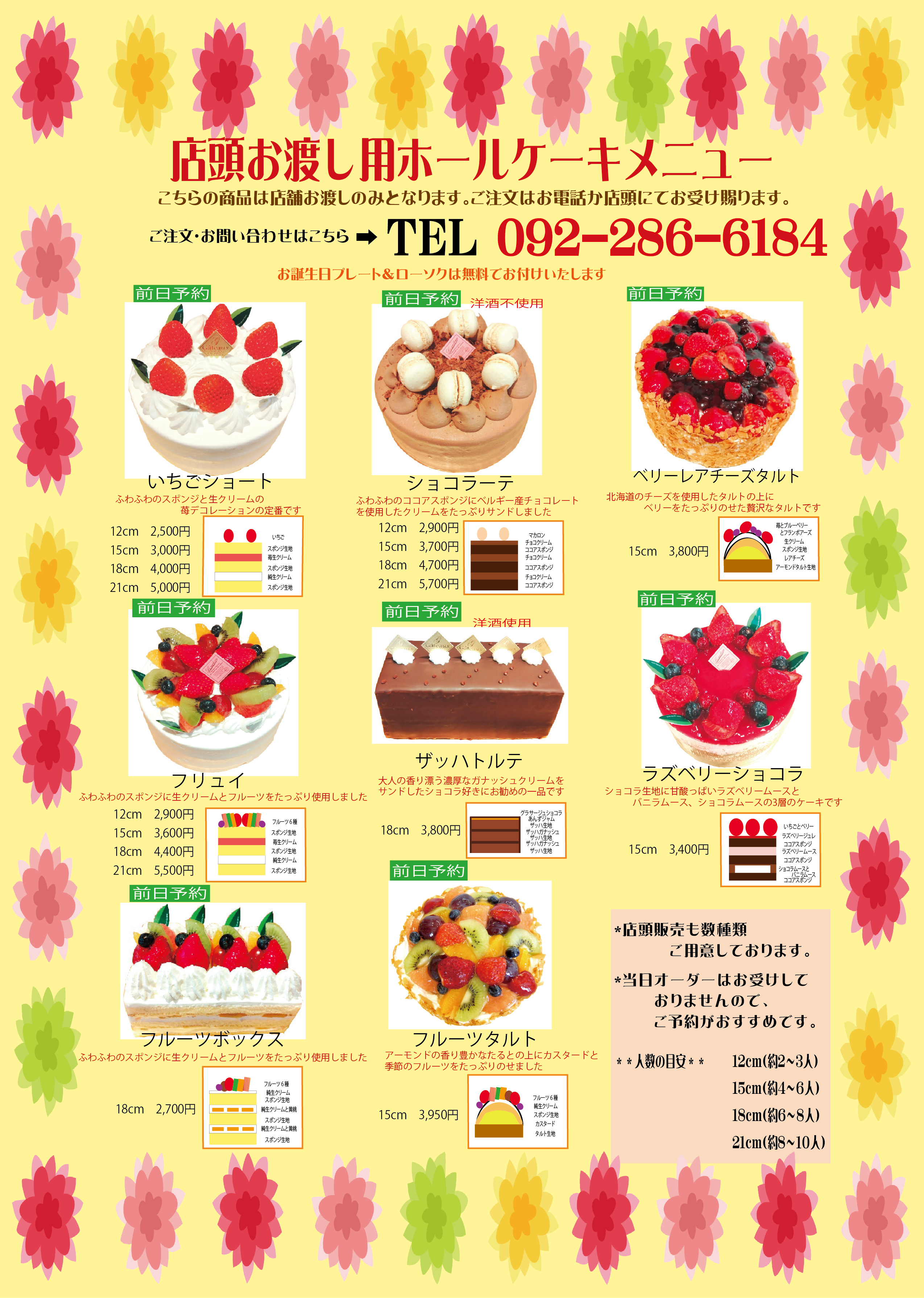 10月1日より原材料価格高騰の為、ホールケーキメニューの一部価格改訂をさせていただきます。ご確認のほどよろしくお願いいたします。
