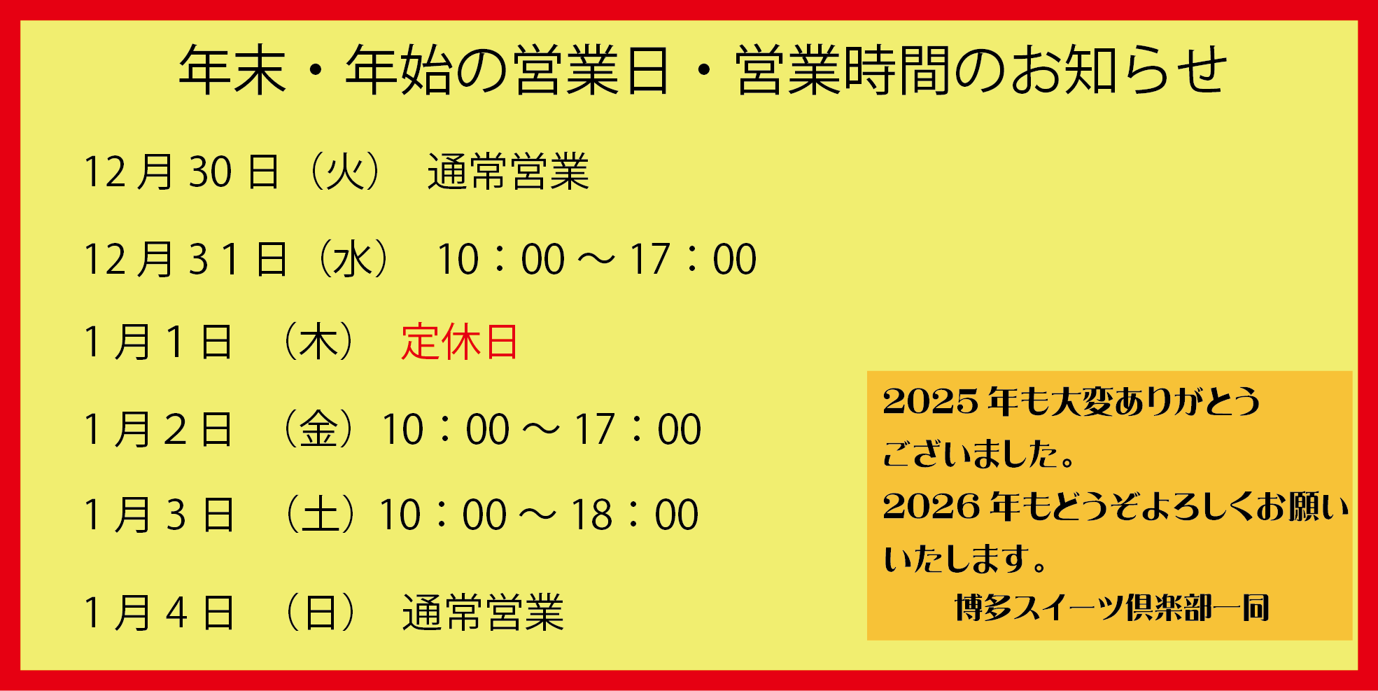 年末年始営業日のおしらせ
